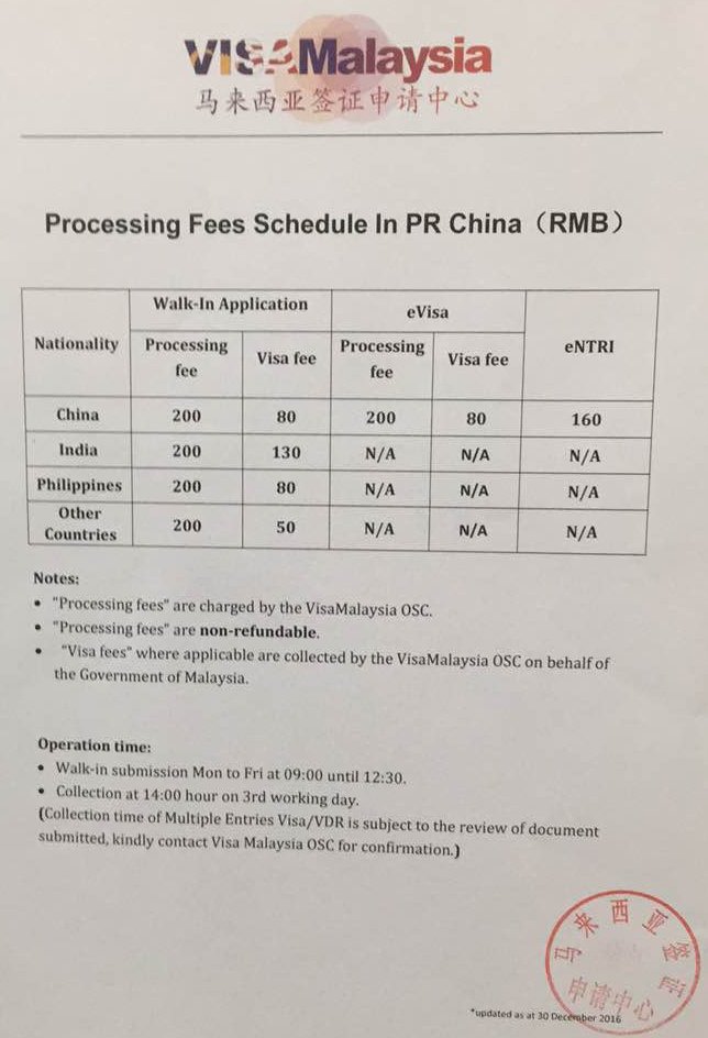 马来西亚签证中心通知:自2017年1月1日起,恢复收取使馆签证费用。