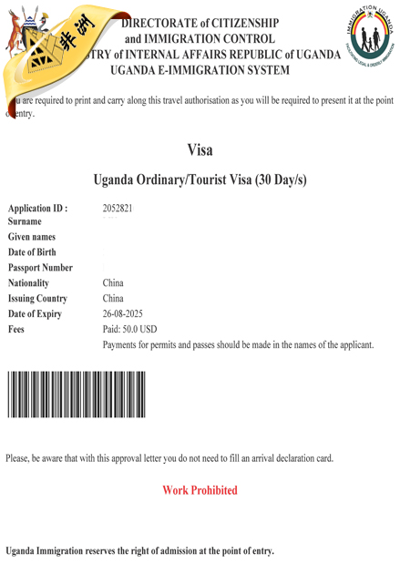 乌干达驻外使领馆暂不颁发工作签证,到乌工作人员进入乌境内后再申换工作签证,未得到工作签证前不得在乌境内工作。